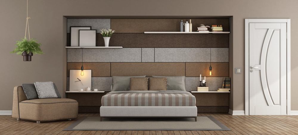 Die Kollektion „Modernes Luxusdesign“ steht für Möbel, die Wohnräume in exklusive Boutique-Suiten verwandeln. Charakteristisch sind breite, geometrisch gestaltete Kopfteile, vertikal gepolsterte Paneele und elegante Stoffe in Beige, Grau und Taupe. Goldene Akzente setzen luxuriöse Highlights, ohne überladen zu wirken.